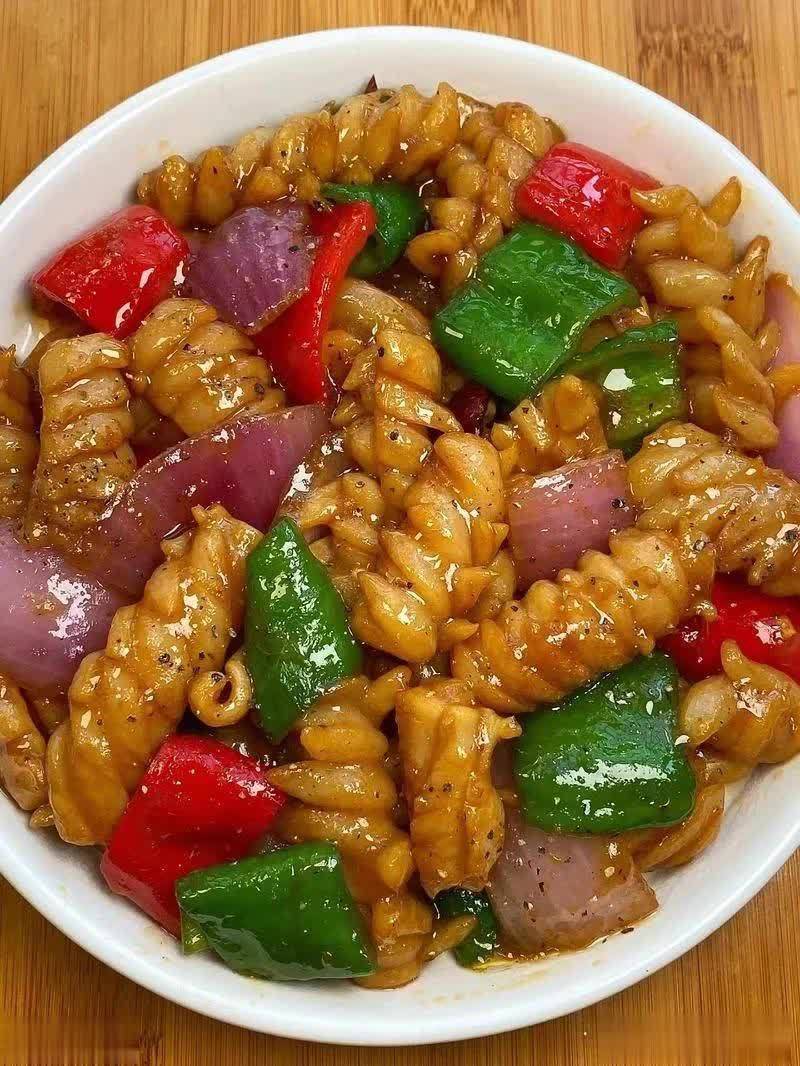 5. 加入青椒和红椒:将青椒和红椒条加入锅中,翻炒均匀,炒至蔬菜变软。