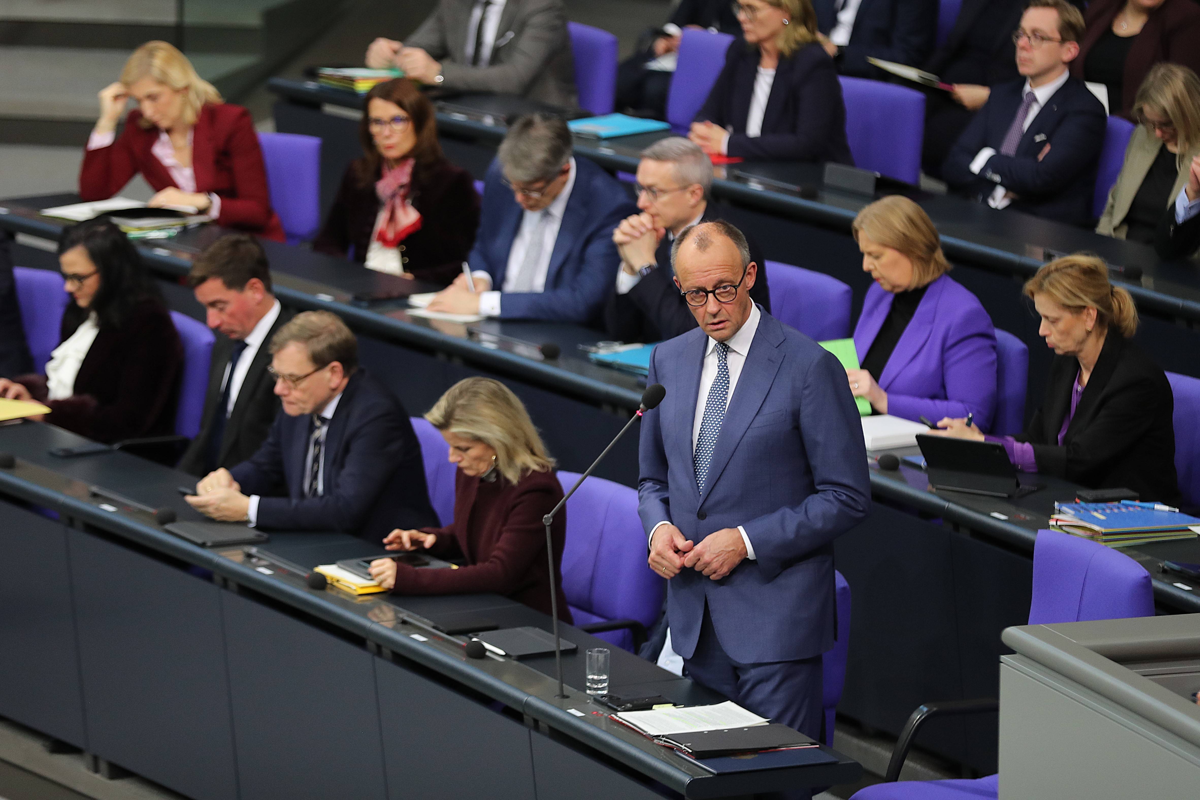 2025年12月17日,德国总理默茨(前排右一)在位于柏林的德国联邦议会接受例行问询。新华社记者杜哲宇摄默茨当天在德国柏林与立陶宛总理因加·鲁吉尼埃内共同出席记者会时说,德国当前正与法国就继续联合研制并生产战机的具体领域进行密切磋商,“预计将在今后数周内作出共同决策”。